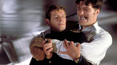 If Amasova is the greatest triumph of 'The Spy Who Loved Me', then conversely the main villain Karl Stromberg is its greatest weakness. There's nothing that bad about him really, but he's just a rather generic baddie - the bread and butter if you like. He has an elaborate base (the exterior of which is a great bit of miniature model work by the way), several henchmen and wants to screw over the world for his own means. He even feeds people to sharks, as we've encountered with villains of yesteryear like Largo. But ultimately Stromberg is little more than a lukewarm amalgam of past Bond villains. Fortunately, the spotlight is kind of usurped by Richard Kiel as Jaws. There's a good reason why Jaws is by far the more recognizable, iconic villain. Kiel is perfect casting too - not only does his 7ft+ height make him a towering physical presence, but the way he stays mostly silent and how good he is at giving a sinister smile leaves a far stronger impression. At several points he provides some actually good jump-scares, plus I think there's something more threatening about a villain that prefers not to use a gun but who gets much closer up when attacking people, to the extent that his finishing move is to bite them with his metal... well, jaws.